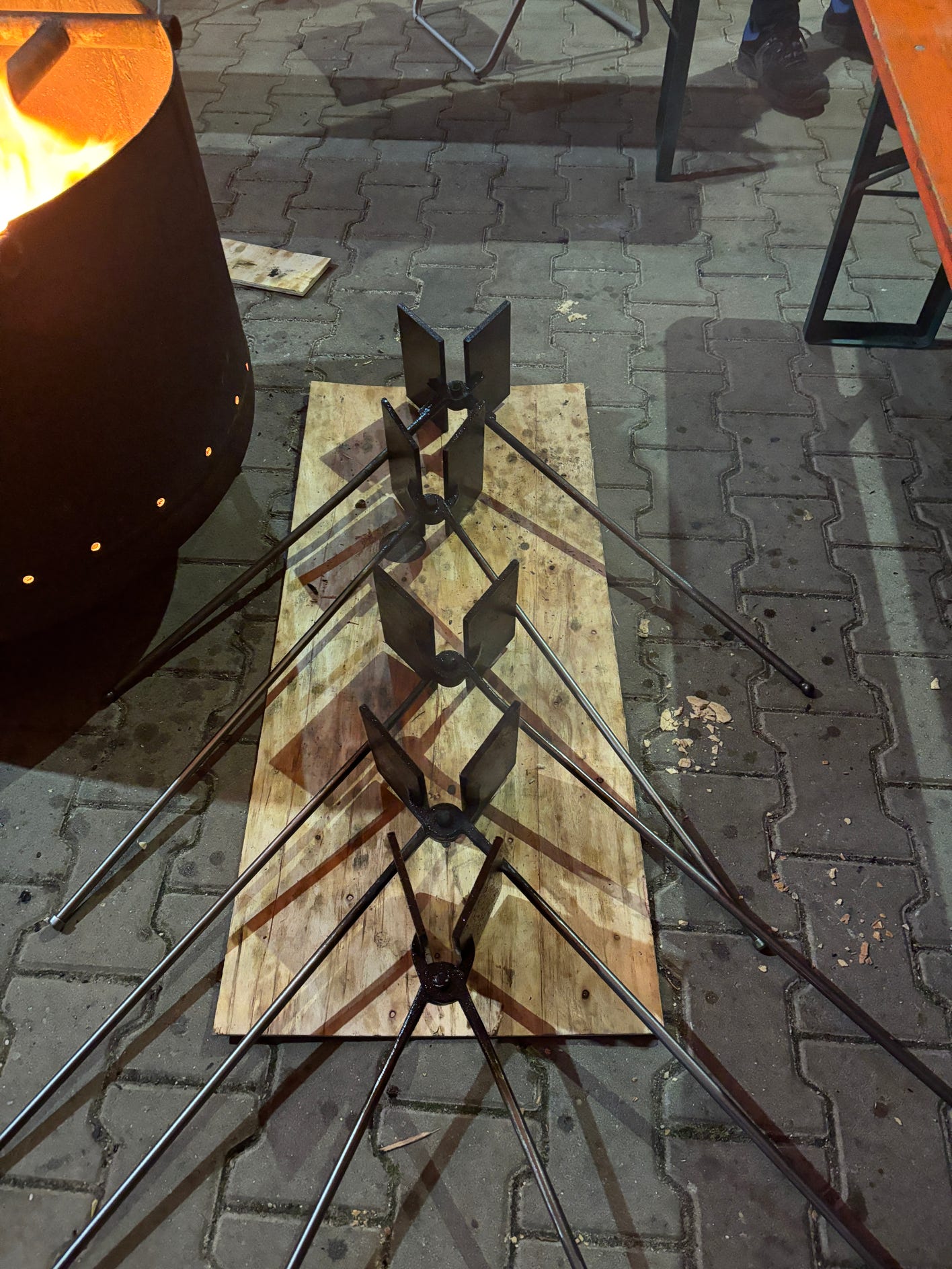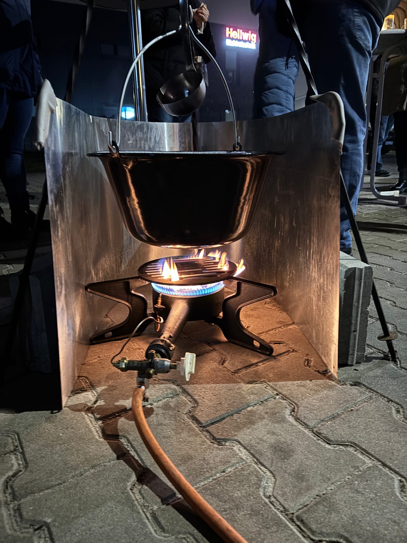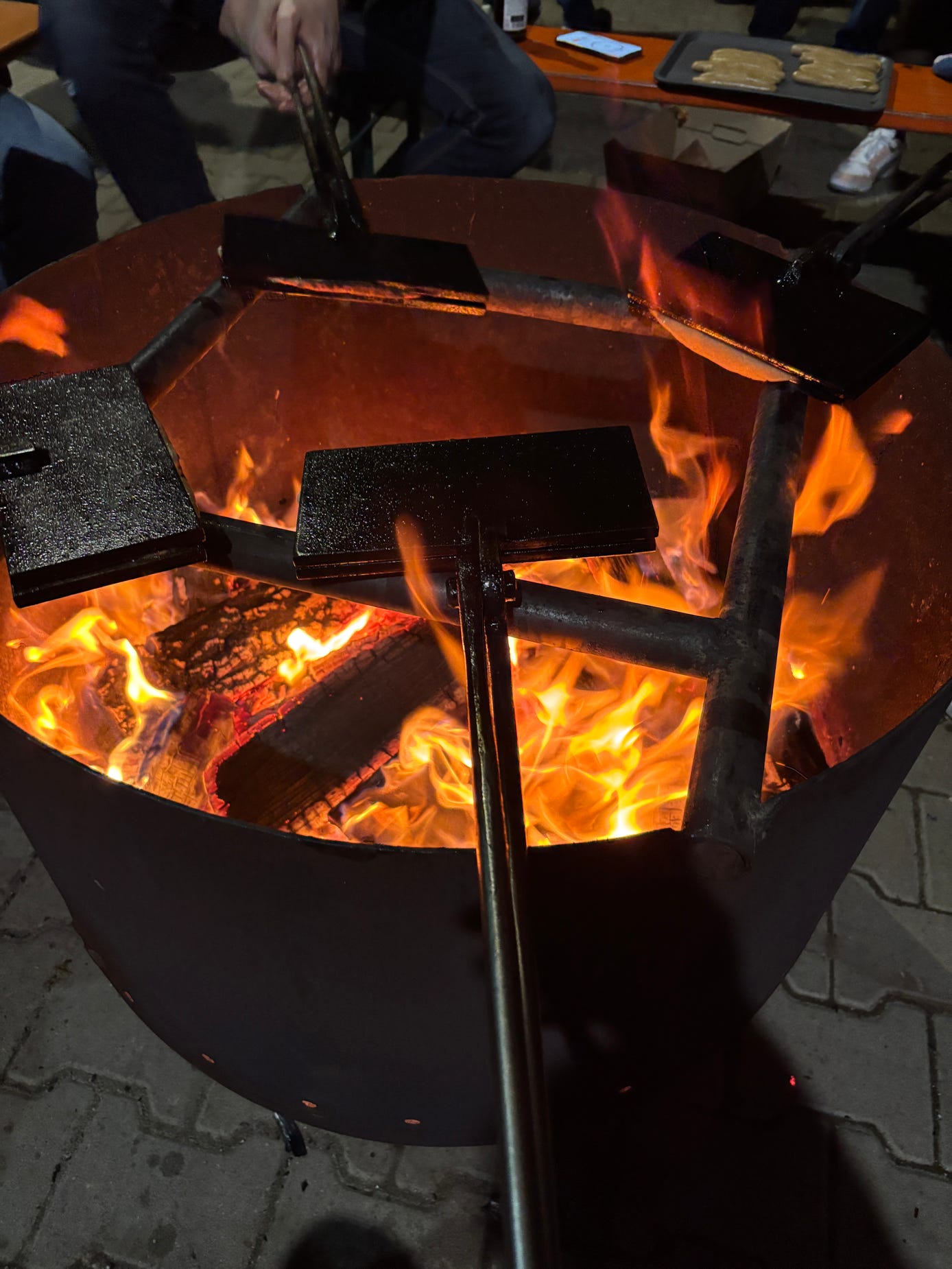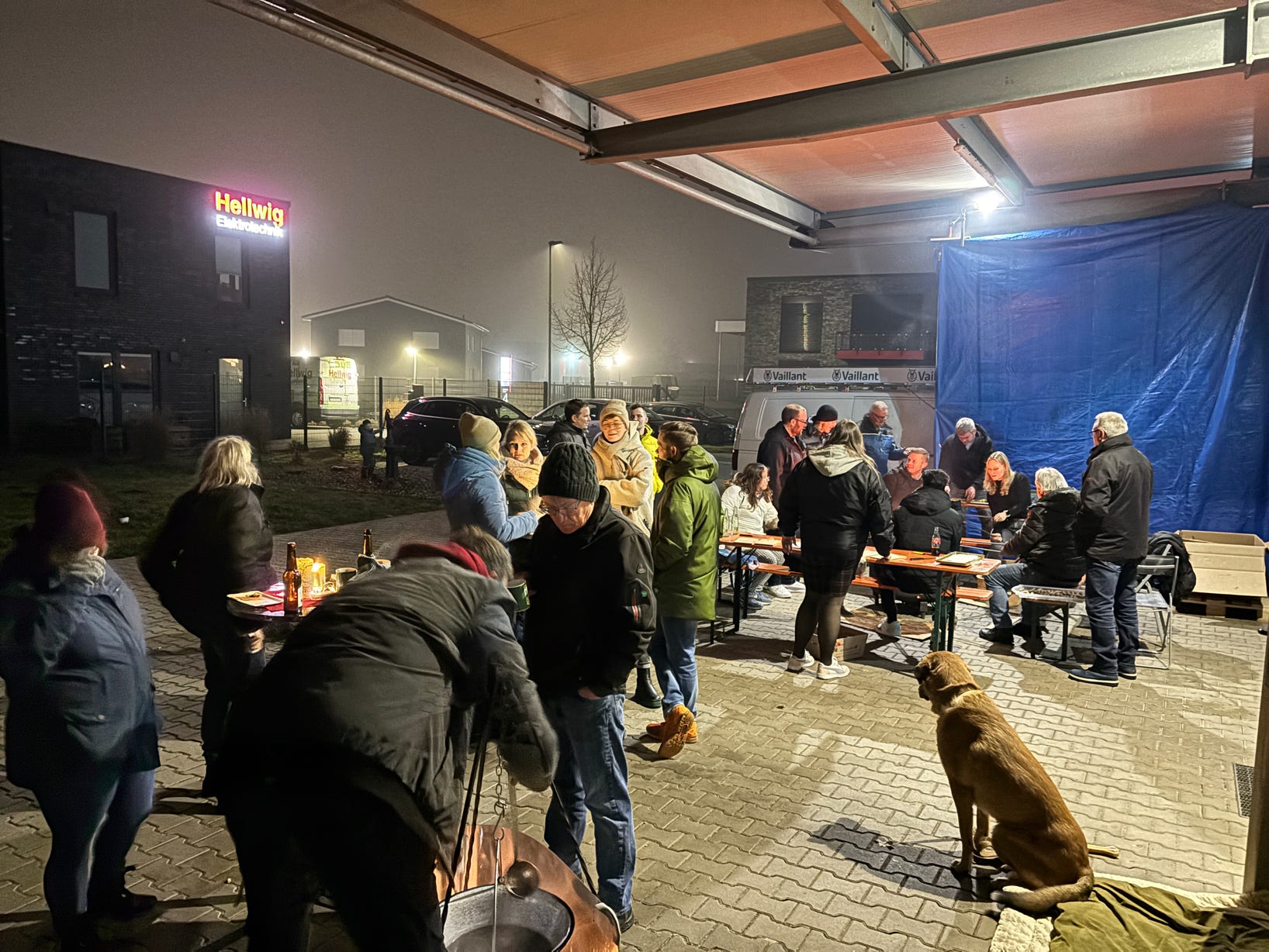 Zum Ende des Jahres 2024 haben wir wieder unser traditionelles Schuhsohlen-Backen veranstaltet. Kunden, Freunde und Familie haben sich eingefunden, diese alte Grafschafter Tradition zu pflegen. Mit individuell hergestellten, gußeisernen Waffeleisen wurden die „Schuhsohlen“ über dem offenen Feuer gebacken. Sage und schreibe 30 kg Teig wurden zu ca. 1.000 Waffeln verbacken! Herzlichen Dank an alle, die dieses tolle Event vorbereitet haben!