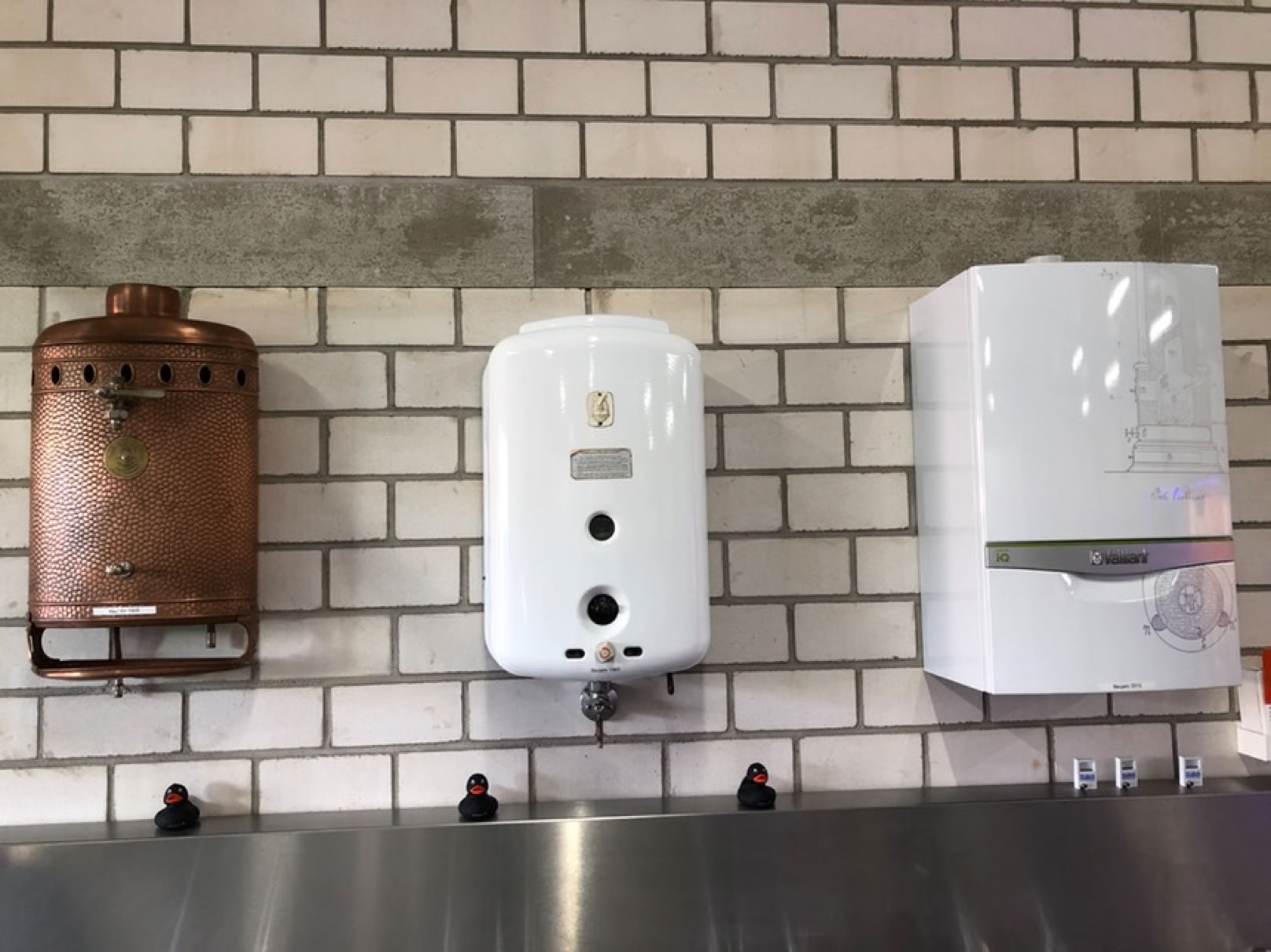 Ein Eindruck von der Entwicklung der Vaillant Warmwasser-Durchlauferhitzer. Links im Bild ein Gerät aus dem Jahr 1926, in der Mitte eines von 1963 und rechts ein aktuelles Gerät.